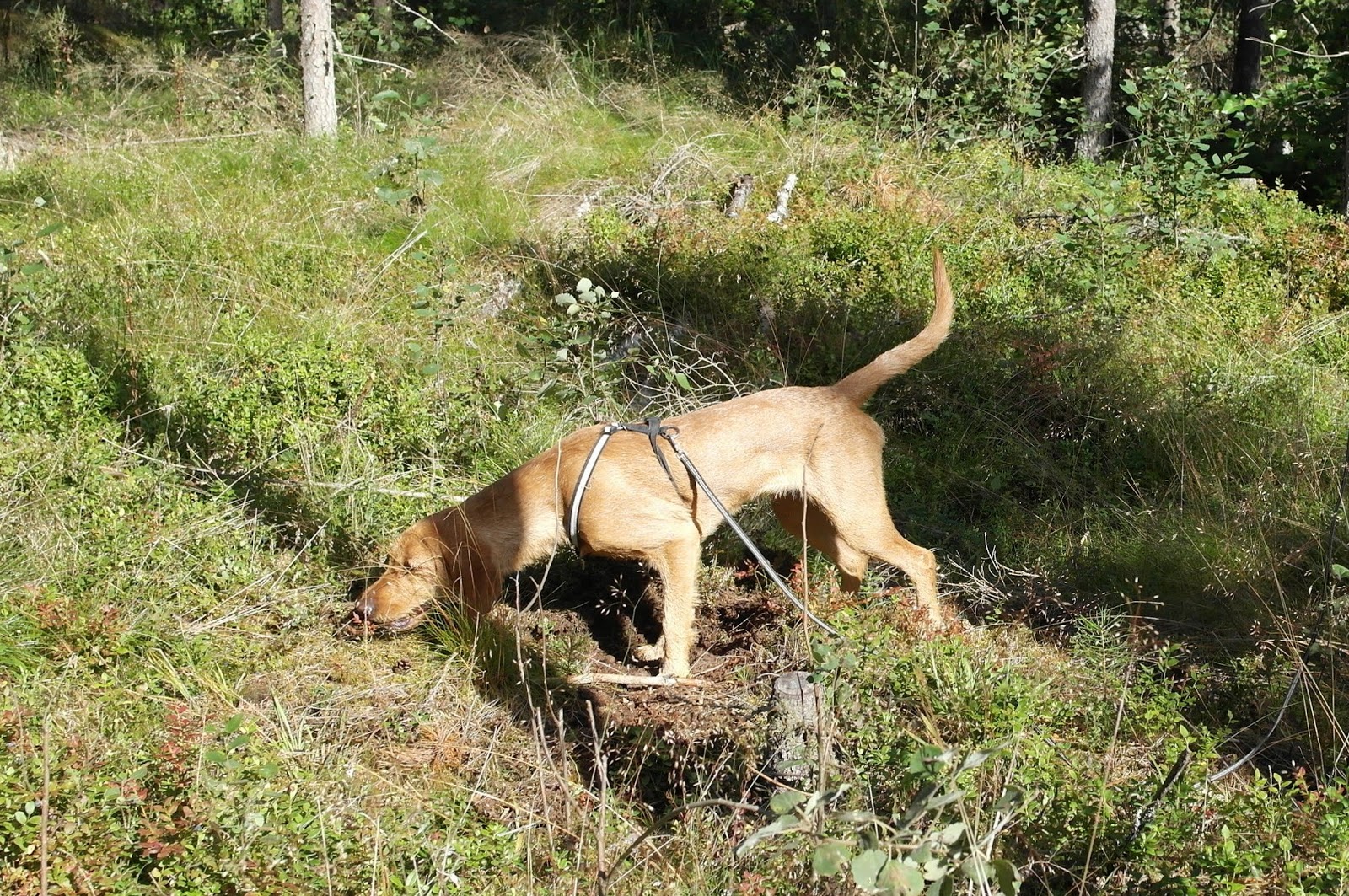 Nälkäisenä oleminen vaikutti kohottavan jäljestysmotivaatiota, joka räiskyi melkein liiallisena intona. Jarrutin sormet verillä jälkiliinan toisessa päässä. Tietysti yli-innokkuus näkyi ohjaajan silmiin myös ikävänä hutilointina ja haparointina.