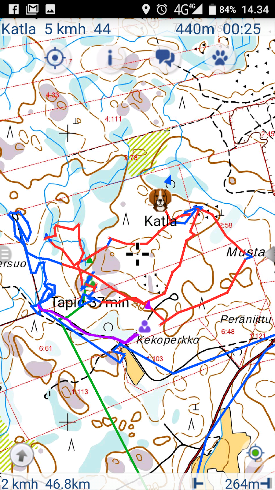 Katla irtosi hakuun innokkaasti Koskenmetsään. Kävelimme lämpimiksemme alueelle, jossa reilu viikko sitten kuuntelimme Katlan herättelyä. Tällä kertaa Katla kuitenkin päätti lähteä täysin eri suuntaan, ja kun hetken tarvottuamme tajusin vilkaista puhelinta, huomasin, että koira oli edennyt selän takana noin 400 metriin. Palasimme siis omia jälkiämme takaisin tielle, jonne päästyämme kuulimme ensimmäiset herättelyt etäämmältä.